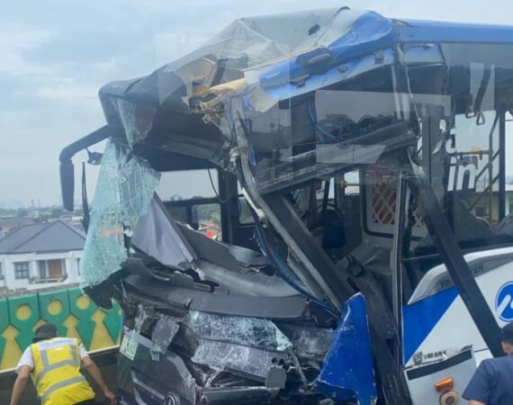 Horor di Jalur Layang! Penampakan 2 Bus TransJakarta Tabrakan di Koridor 13, Bodi Depan Hancur Berantakan